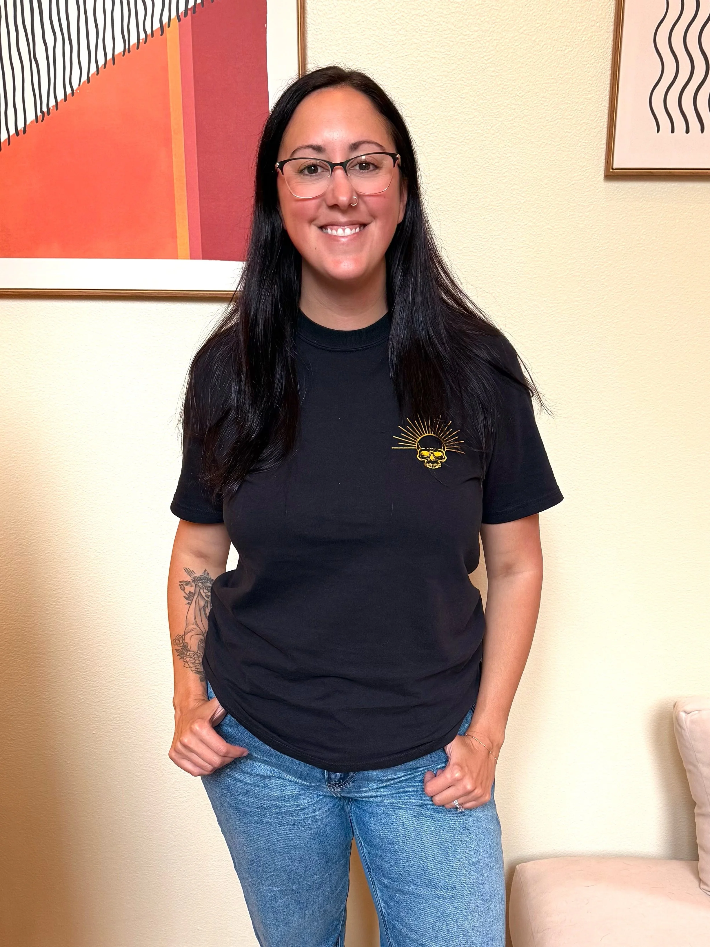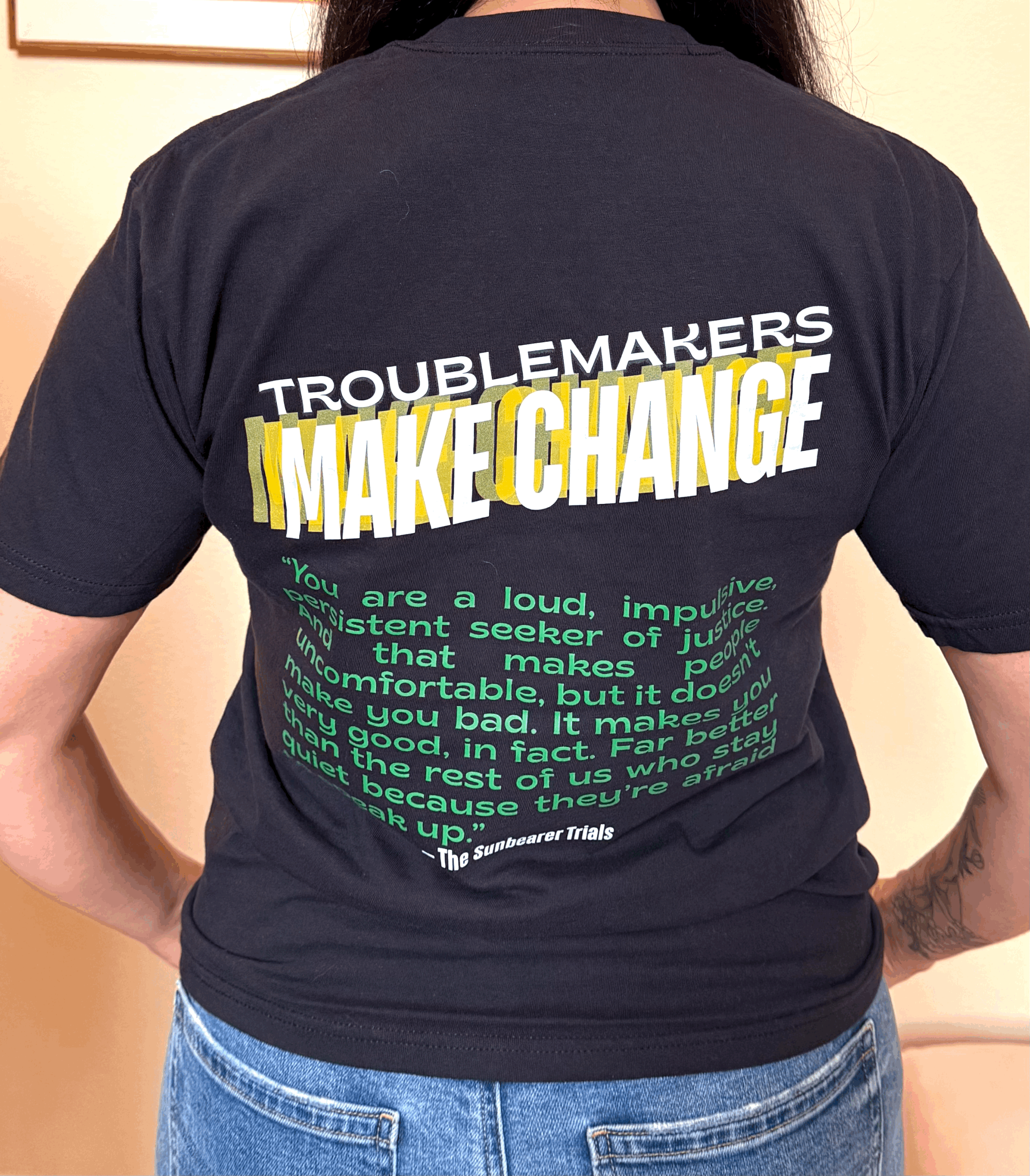 Welcome to The Sunbearer Trials! This world tour-themed shirt features a skull and sunburst crown logo on the front and a large design on the back, along with the names of the competitors from "The Sunbearer Trials" and tour stops across Reino del Sol. Comfort Colors so it's soft and only gets softer with every wash!
